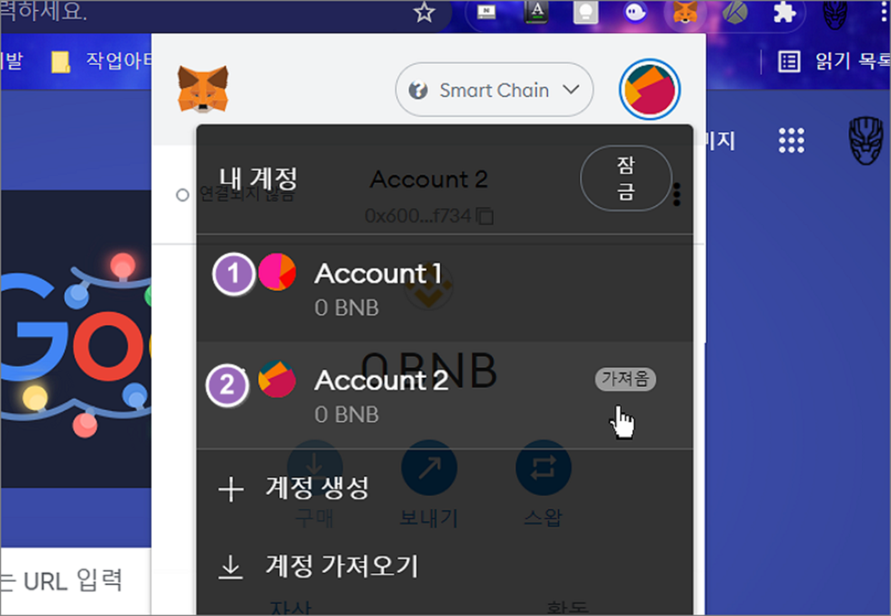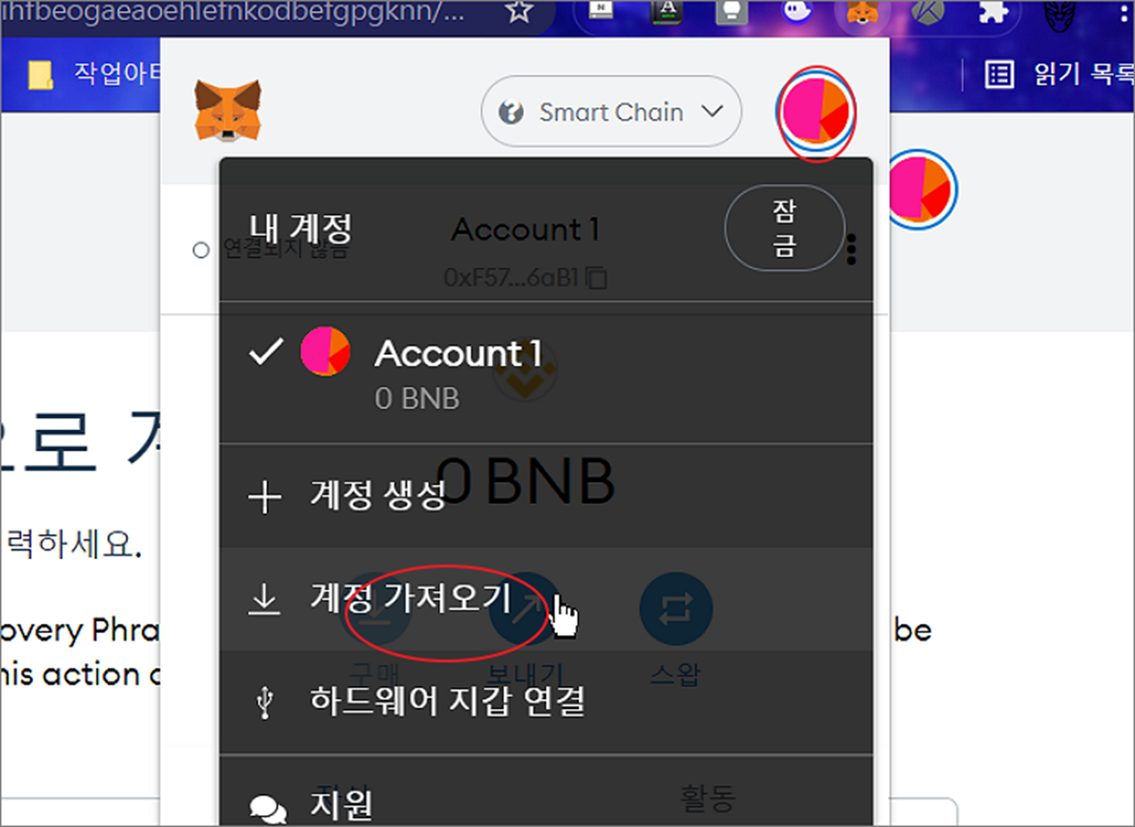 ▼ 다음은 백업한 비공개 키를 이용해서 지갑을 추가해 보겠습니다. 메타마스크는 여러 개의 계정을 관리할 수 있습니다. 다른 관리 지갑을 백업 받은 비공개 키로 추가하고 싶다면 계정 아이콘 > 계정 가져오기 버튼을 클릭합니다.