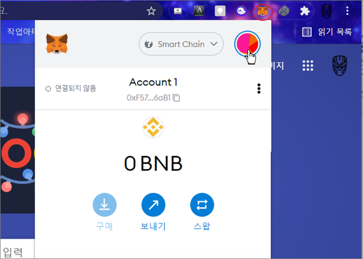 ▼ 먼저 비공개키를 백업해 보겠습니다. 크롬 확장 프로그램에서 메타마스크를 실행합니다.