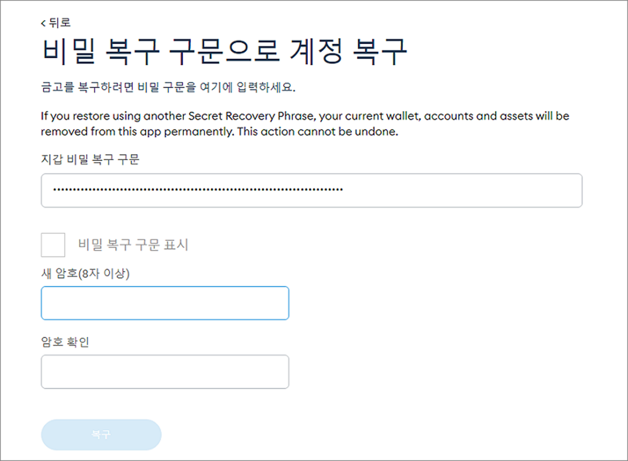 ▼ 다운받은 복구 문구를 입력하고 비밀번호를 다시 세팅합니다.