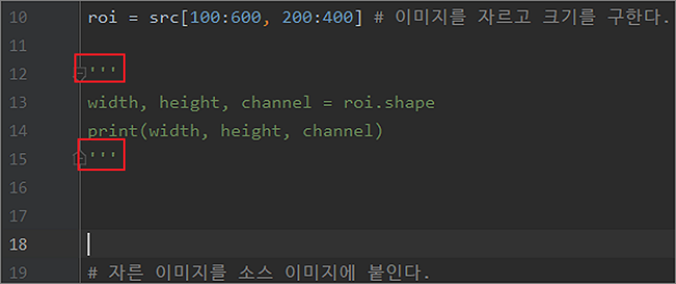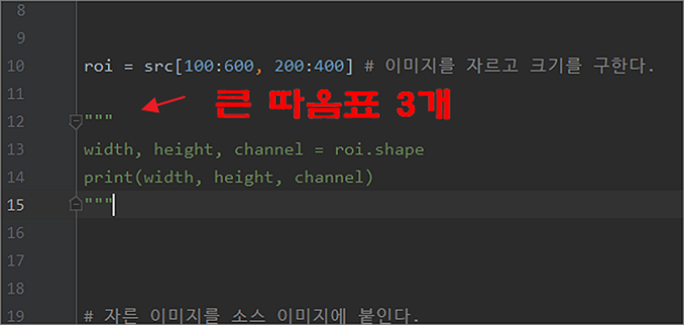 ▼ 두 번째는 큰 따옴표와 작은 따옴표로 여러 줄을 한번에 주석 처리하는 방법입니다.