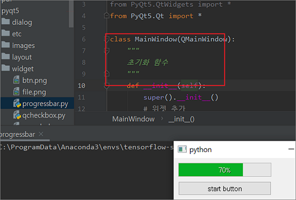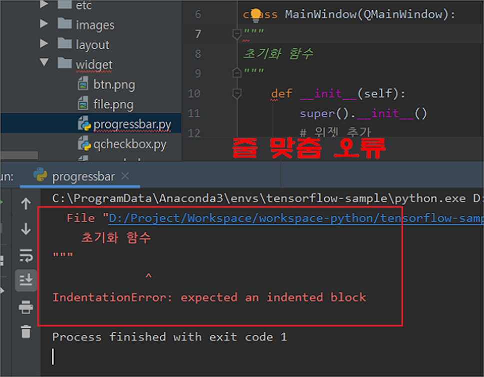 ▼ 주석도 일반 코드처럼 파이썬에서는 줄을 맞춰야 합니다. 한 주석인 # 은 문제가 되지 않지만 여러 줄 주석인 3개의 따옴표는 명확하게 범위에 맞도록 들여쓰기를 해야 합니다. 아래 그림처럼 함수에 대한 주석을 클래스 들여쓰기에 맞춰져 있어서 오류가 발생한 것입니다.