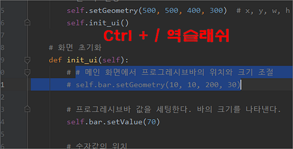 ▼ Ctrl + /(역슬래쉬) 를 클릭하면 선택한 영역의 모든 줄을 주석 처리합니다. 해당 단축키는 파이참, VSCode 등의 통합개발툴에서 공통적으로 사용하는 주석 단축키입니다. 참고로 파이썬에서 제공하는 기본 IDEL 는 ALT + 3 (주석 적용), ALT + 4 (주석 제거) 입니다.